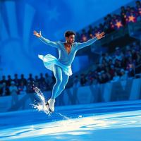 olympic figure skating contestant dressed in blue contest suit with a luminous blue background and spactators