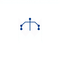 Minimal bold letter M logo, solid geometric M shape with small V-shaped connector lines bridging between the two vertical strokes like tree branches or hierarchy levels, indigo blue, flat vector, clean modern SaaS logo, white background